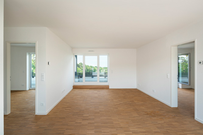 Alle Drei- und Vierzimmerwohnungen und ein Teil der Zweizimmerwohnungen sind im Wohn-Essbereich von Norden nach Süden bzw. von Osten nach Westen durchgesteckt. Sie profitieren dadurch sowohl von der Qualität des Umfeldes (Wald, Kleingartenanlage, begrünter Straßenraum, wie auch des grünen Innenhofs). Außerdem sind sie von morgens bis abends besonnt.