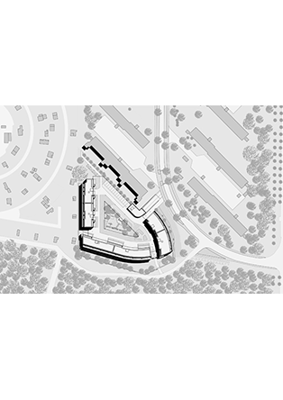 So bilden die drei Baukörper zusammen mit der ganz im Süden liegenden Bestandszeile einen Kopf, der sich im Süd-Osten über geschwungene Baukörper zuspitzt. Dieser Kopf ist der Kopf eines Fisches mit den langen Gräten.