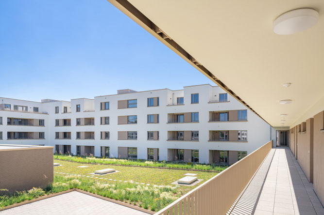 Die kompakten Wohnhäuser mit einem günstigen A/V-Verhältnis (Außenfläche zu Volumen) werden alle über Drei- bzw. Vierspänner wirtschaftlich erschlossen.